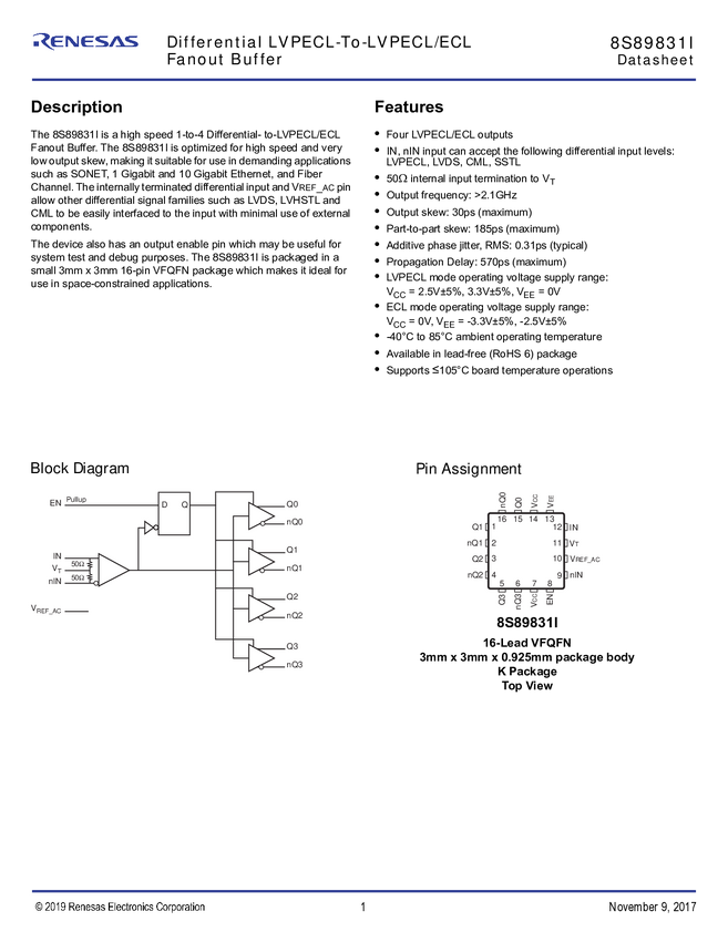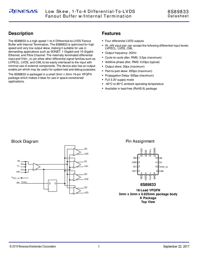 Low Skew,1-to-4 Differential-to-LVDS Fanout Buffer W/Internal Termination