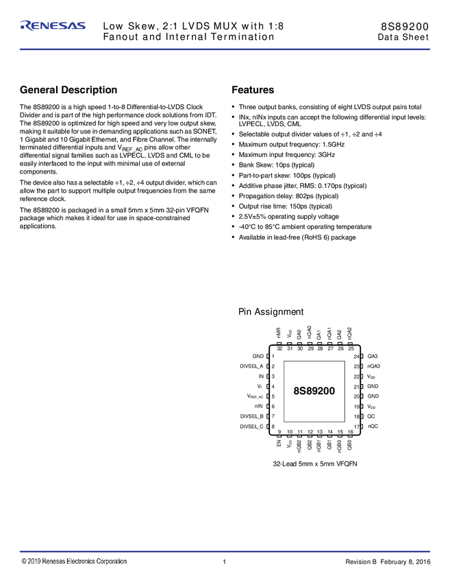 Low Skew, 2:1 LVPECL MUX With 1:8 Fanout And Internal Termination