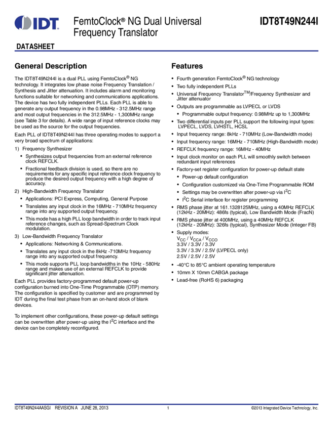 FemtoClock NG Dual Universal Frequency Translator (4-in/2-PLL/8-out)