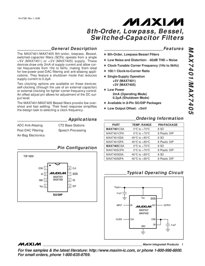 MAX7405 +3V, 8th-Order, Lowpass, Bessel, Switched-Capacitor Filter