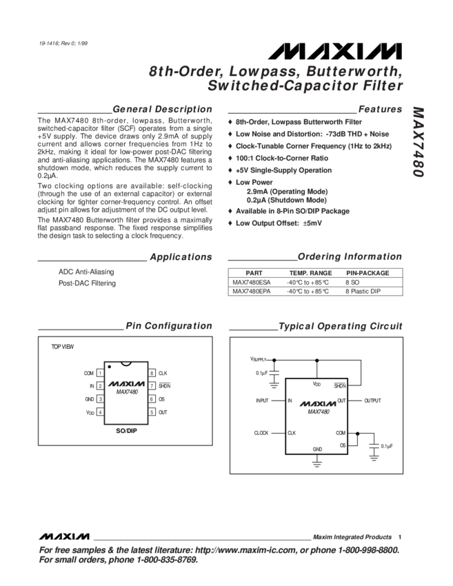 MAX7480 8th-Order, Lowpass, Butterworth, Switched-Capacitor Filter