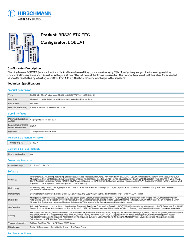 Switch przemysłowy Ethernet Hirschmann BRS20-8TX-EEC 942 170-012