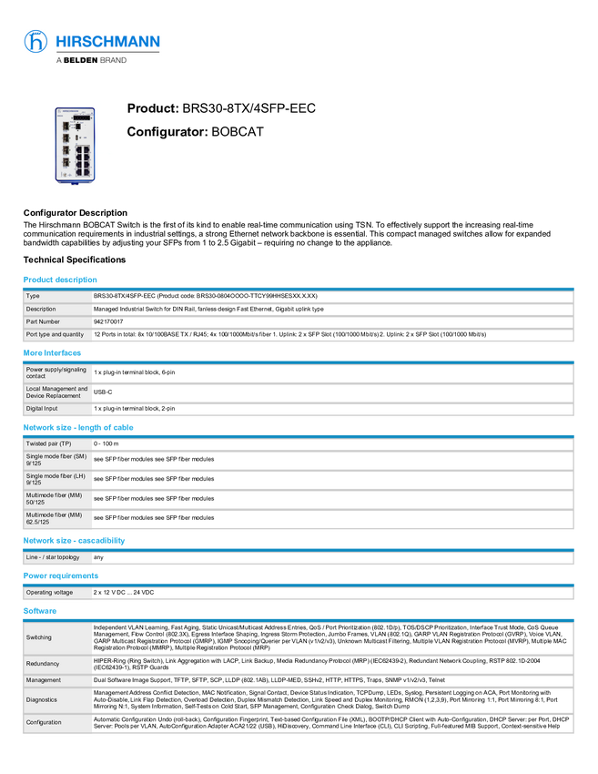 Switch przemysłowy Ethernet Hirschmann BRS30-8TX/4SFP-EEC 942 170-017