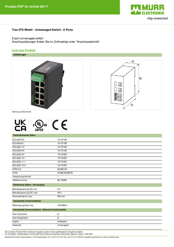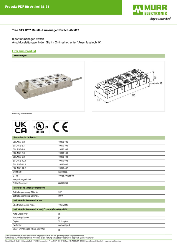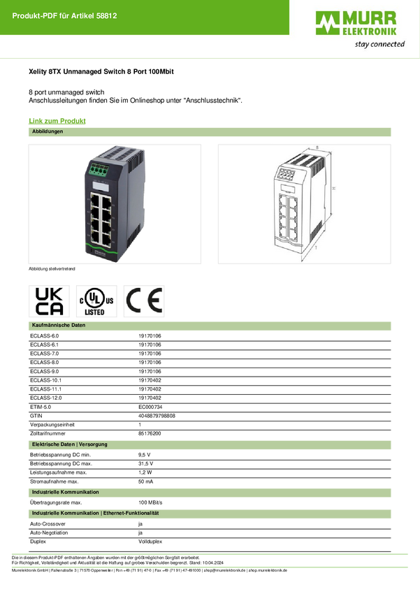 Switch sieciowy RJ45 Murrelektronik Xelity 8TX 58812, 8, 10 MBit/s, 100 MBit/s