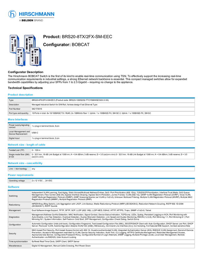 Switch przemysłowy Ethernet Hirschmann BRS20-8TX/2FX-SM-EEC 942 170-016