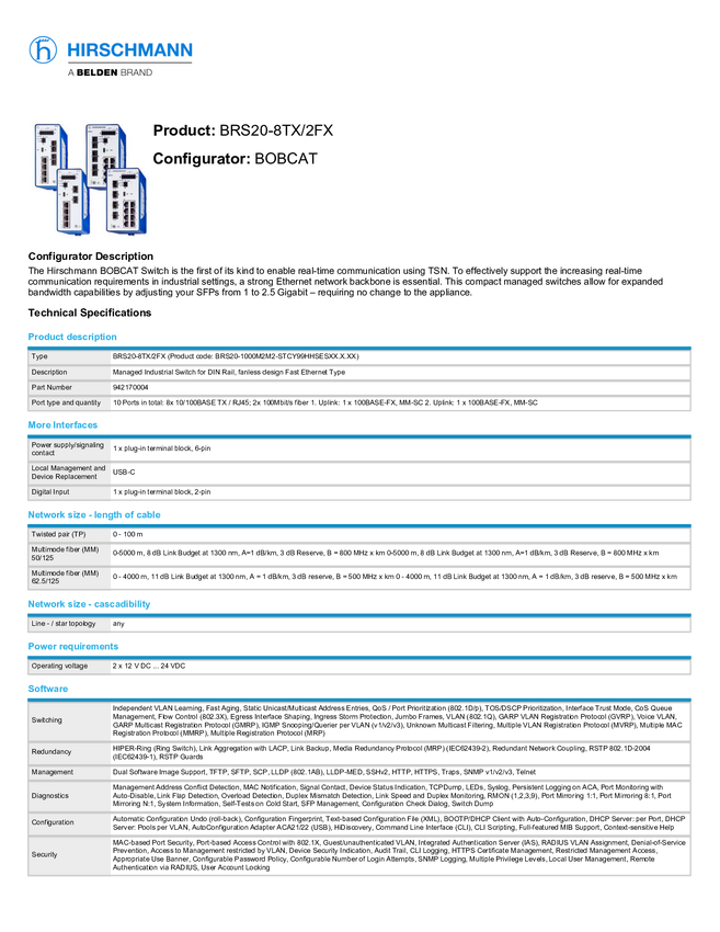 Switch przemysłowy Ethernet Hirschmann BRS20-8TX/2FX 942 170-004