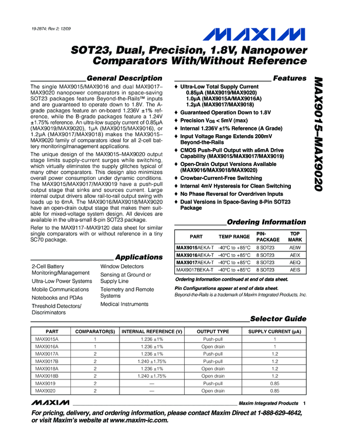 MAX9015, MAX9015A, MAX9016, MAX9016A, MAX9017, MAX9017A, MAX9017B, MAX9018, MAX9018A, MAX9018B, MAX9019, MAX9020 SOT23, Dual, Precision, 1.8V, Nanopower Comparators With/Without Reference
