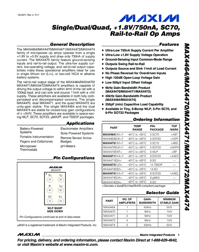 MAX4464, MAX4470, MAX4471, MAX4472, MAX4474 Single/Dual/Quad, +1.8V/750nA, SC70, Rail-to-Rail Op Amps