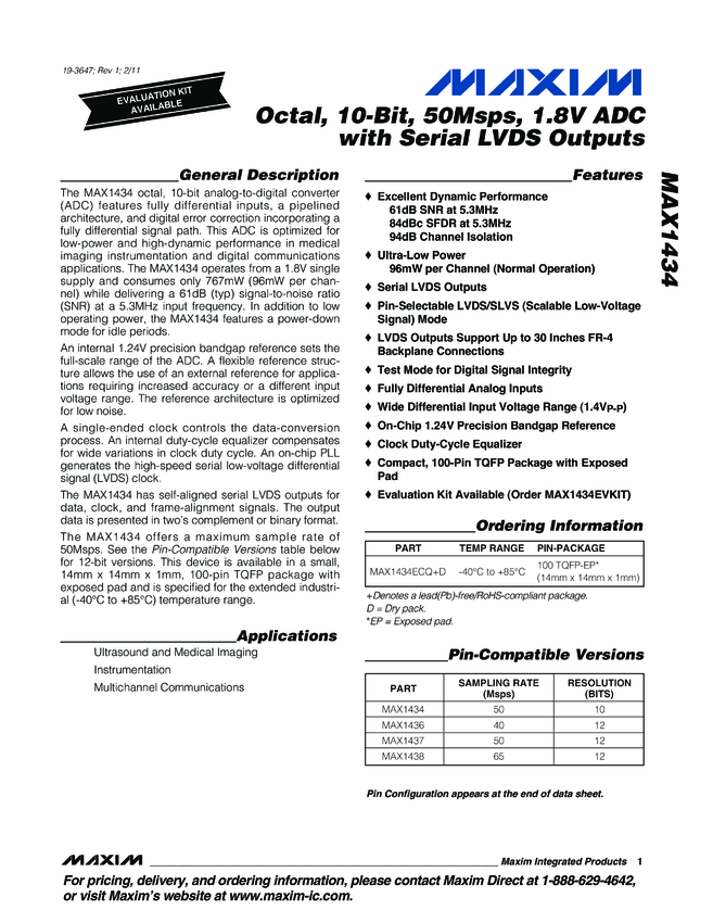 MAX1434 Octal, 10-Bit, 50Msps, 1.8V ADC with Serial LVDS Outputs