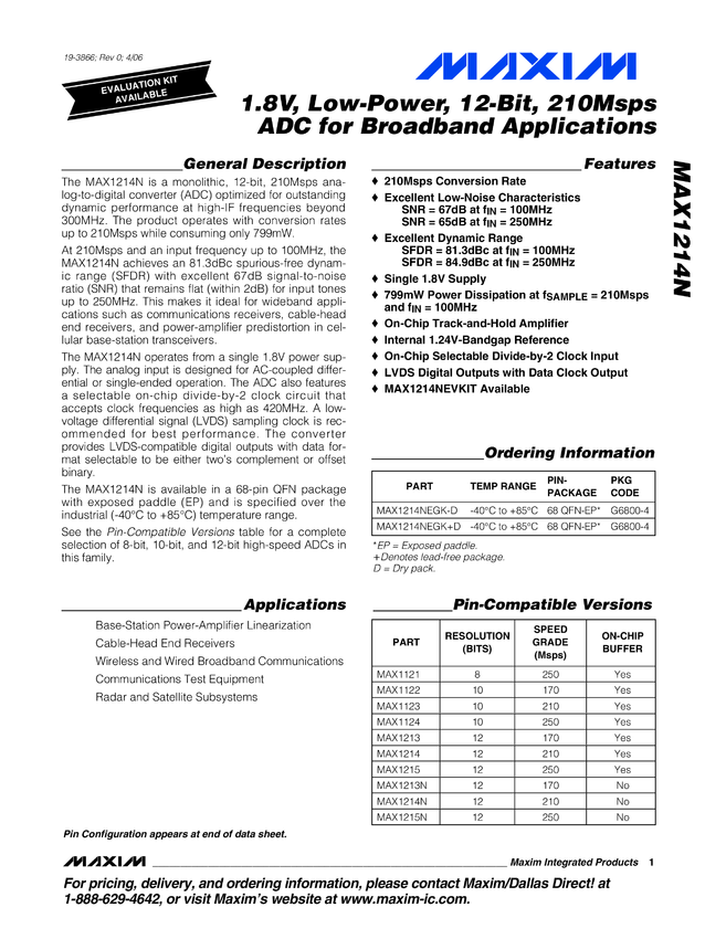 MAX1214N 1.8V, Low-Power, 12-Bit, 210Msps ADC for Broadband Applications