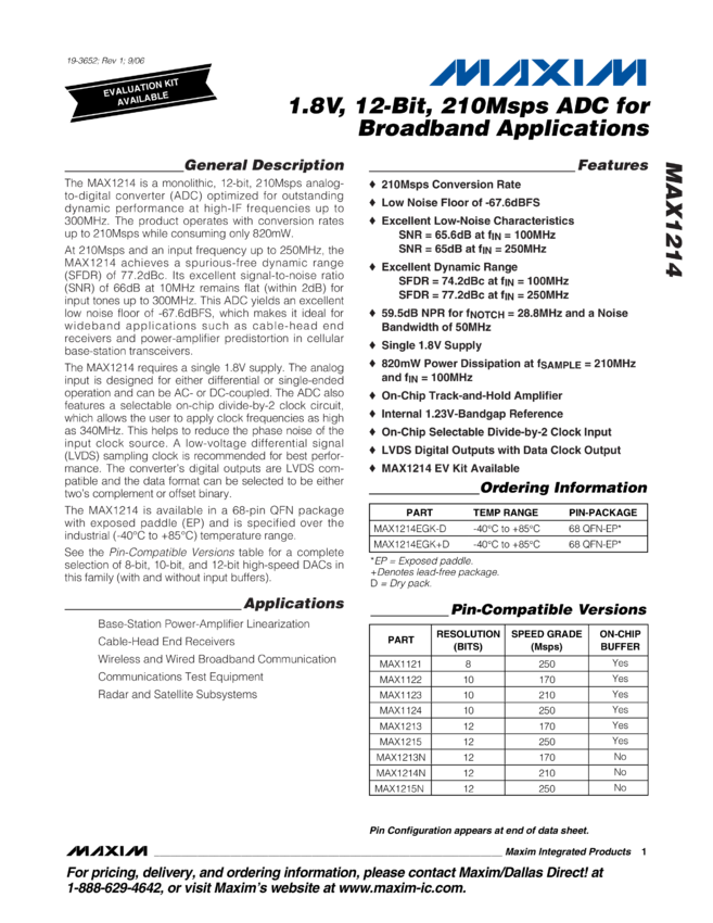 MAX1214 1.8V, 12-Bit, 210Msps ADC for Broadband Applications