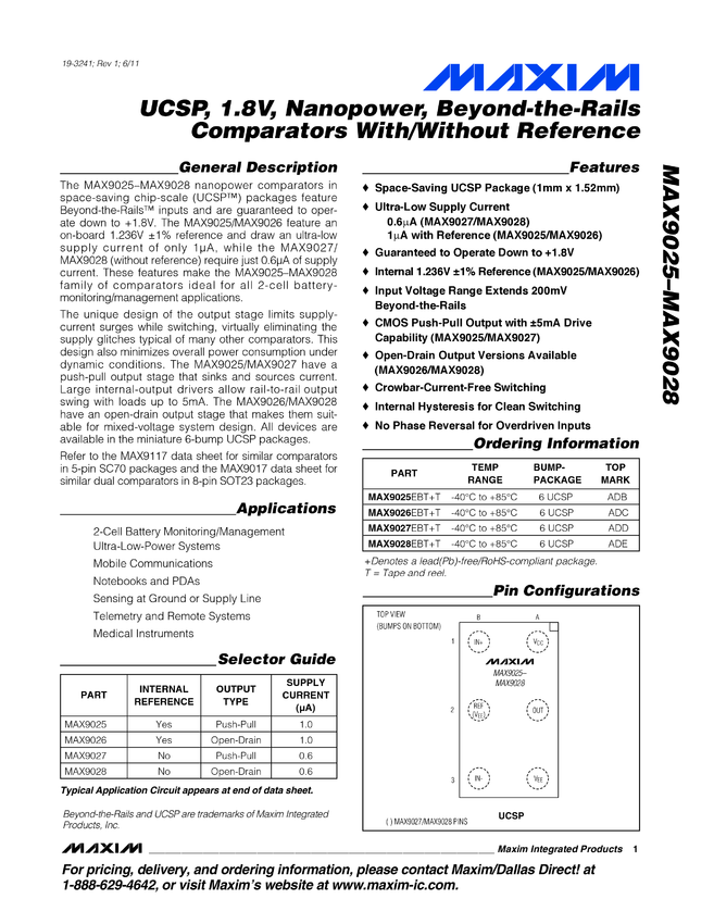 MAX9025, MAX9026, MAX9027, MAX9028 UCSP, 1.8V, Nanopower, Beyond-the-Rails Comparators With/Without Reference