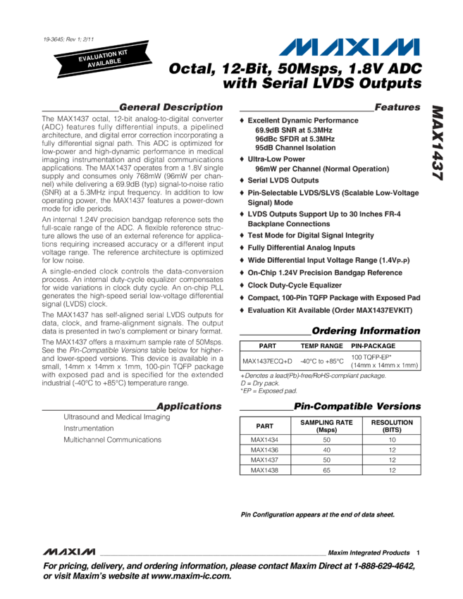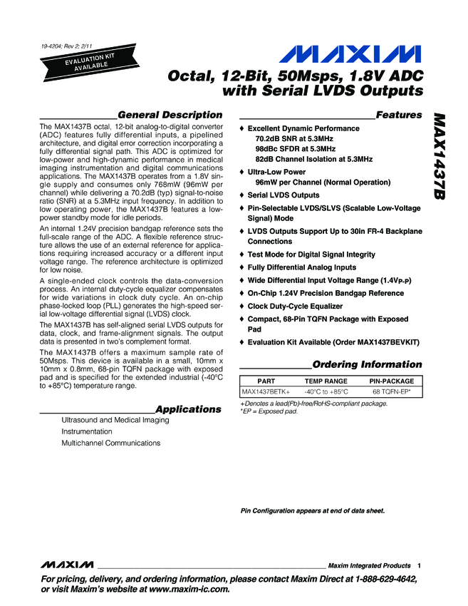 MAX1437B Octal, 12-Bit, 50Msps, 1.8V ADC with Serial LVDS Outputs