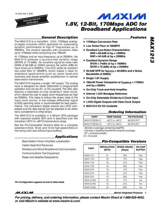 MAX1213 1.8V, 12-Bit, 170Msps ADC for Broadband Applications