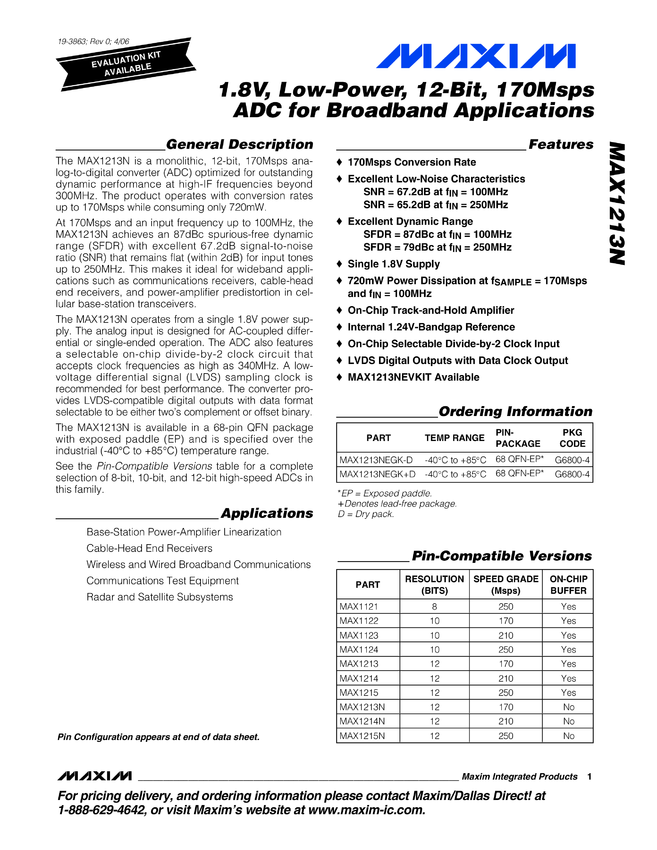 MAX1213N 1.8V, Low-Power, 12-Bit, 170Msps ADC for Broadband Applications
