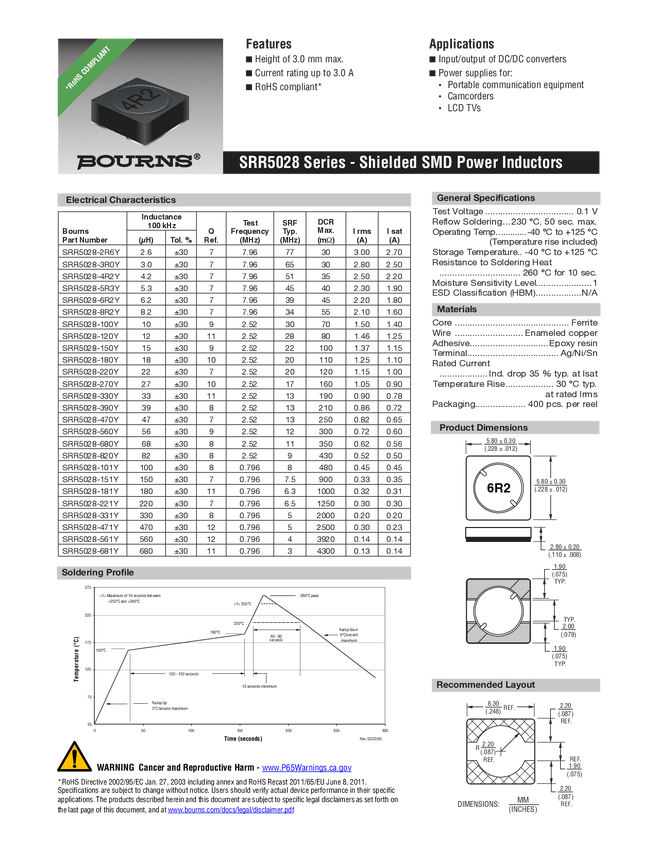 Dławik; drutowy; 33uH; 900mA; 0.19ohm; 30%; -40+125*C; 5,8x5,8x2,8mm; 2222; SMD; SRR5028-330Y; BOURNS; RoHS; op/100szt