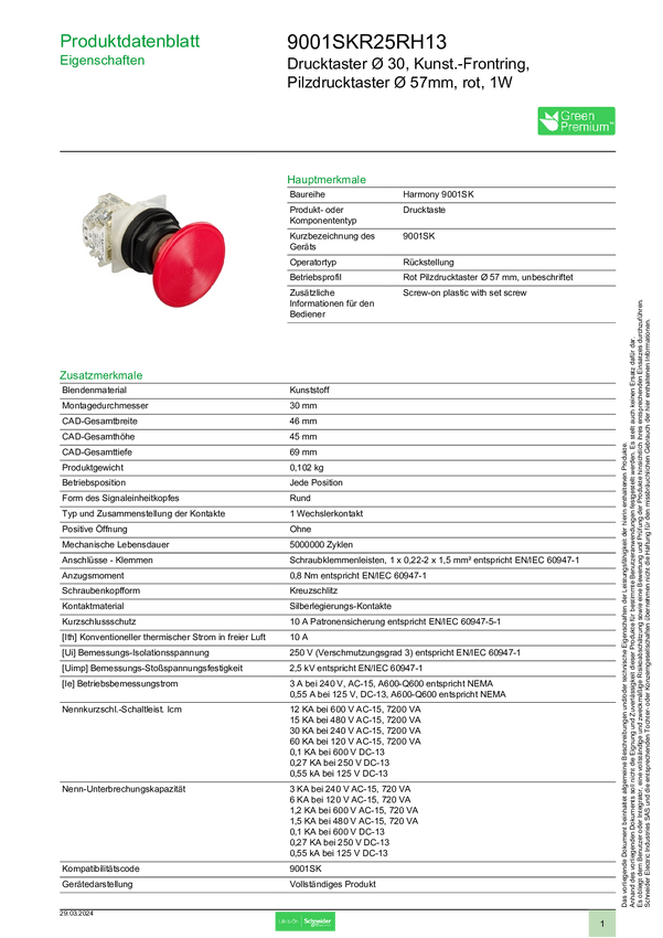 Schneider Electric 9001SKR9RH13 Przycisk grzybkowy, 1 szt.