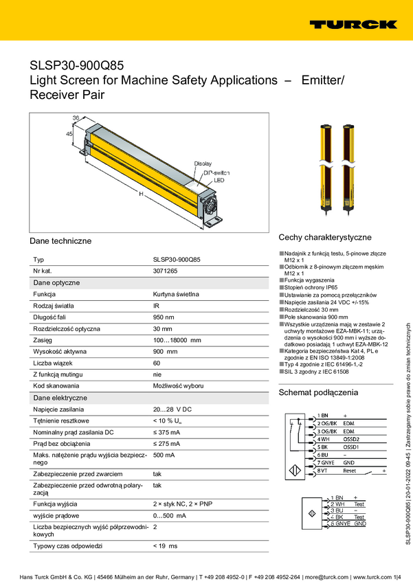 Turck Kurtyna świetlna SLSP30-900Q85 Wysokość ochronna 900 mm