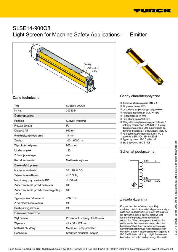 Turck Kurtyna świetlna SLSE14-900Q8 Wysokość ochronna 900 mm