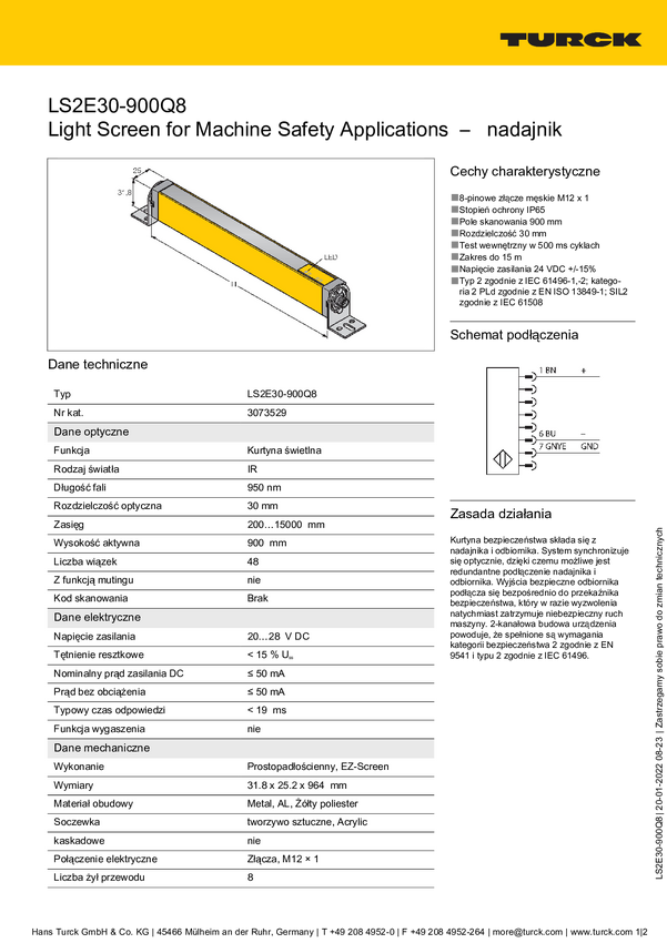 Turck Kurtyna świetlna LS2E30-900Q8 Wysokość ochronna 900 mm