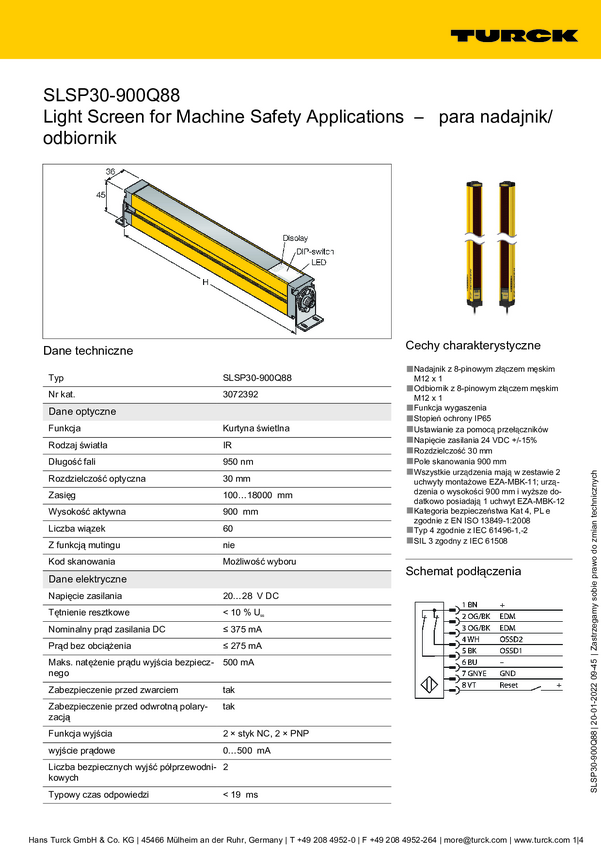 Turck Kurtyna świetlna SLSP30-900Q88 Wysokość ochronna 900 mm
