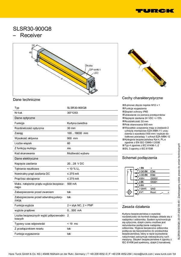 Turck Kurtyna świetlna SLSR30-900Q8 Wysokość ochronna 900 mm