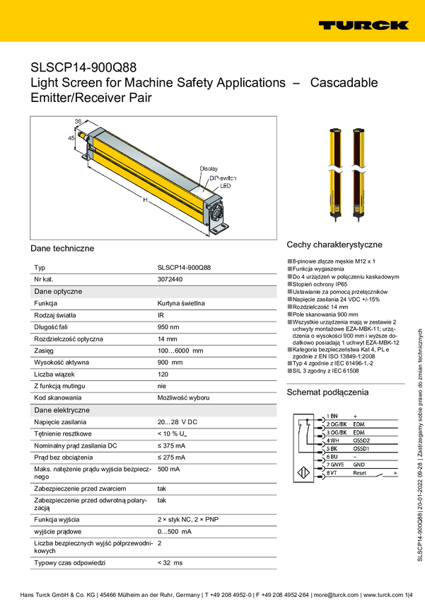 Turck Kurtyna świetlna SLSCP14-900Q88 Wysokość ochronna 900 mm
