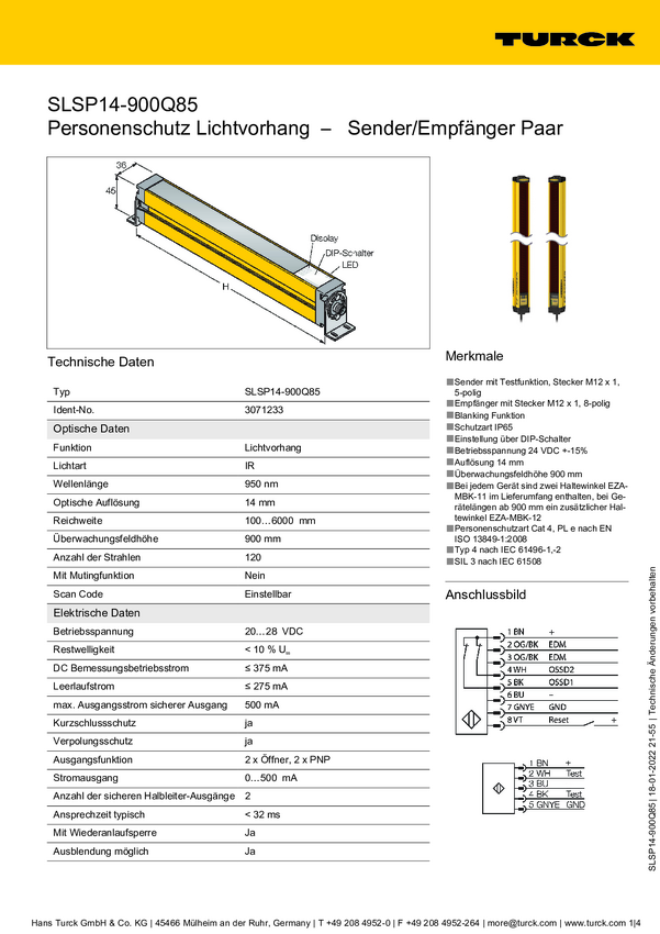 Turck Kurtyna świetlna SLSP14-900Q85 Wysokość ochronna 900 mm