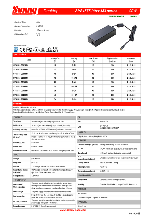 Zasilacz desktop SUNNY 24V 3,75A 90W | SYS1575-9024-M3