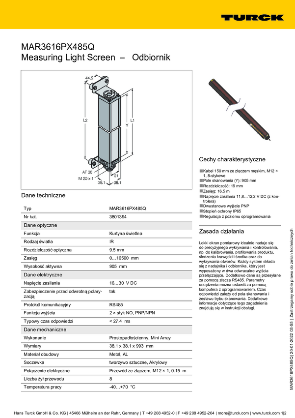Turck Kurtyna świetlna MAR3616PX485Q Wysokość ochronna 905 mm
