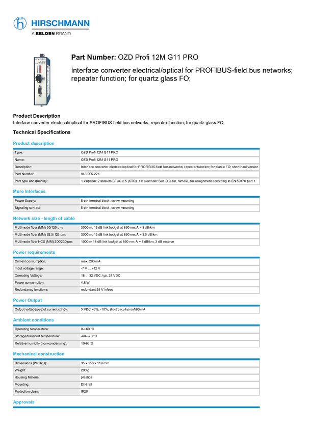 Konwerter interfejsu Hirschmann 943 905-221 Profibus 24 V/DC