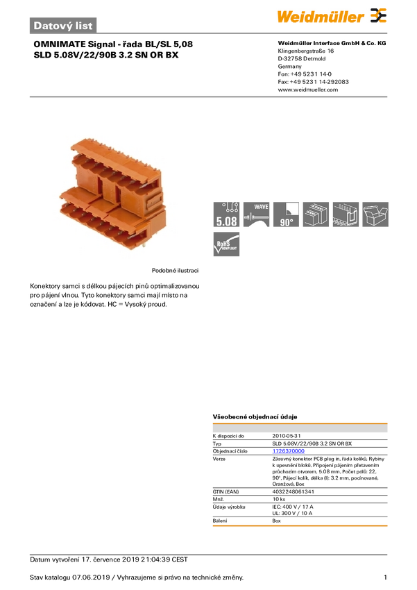 Weidmüller 1726370000 Obudowa złącza pin męskiego na PCB SLD 5.08V/22/90B 3.2 SN OR BX, 10 szt.