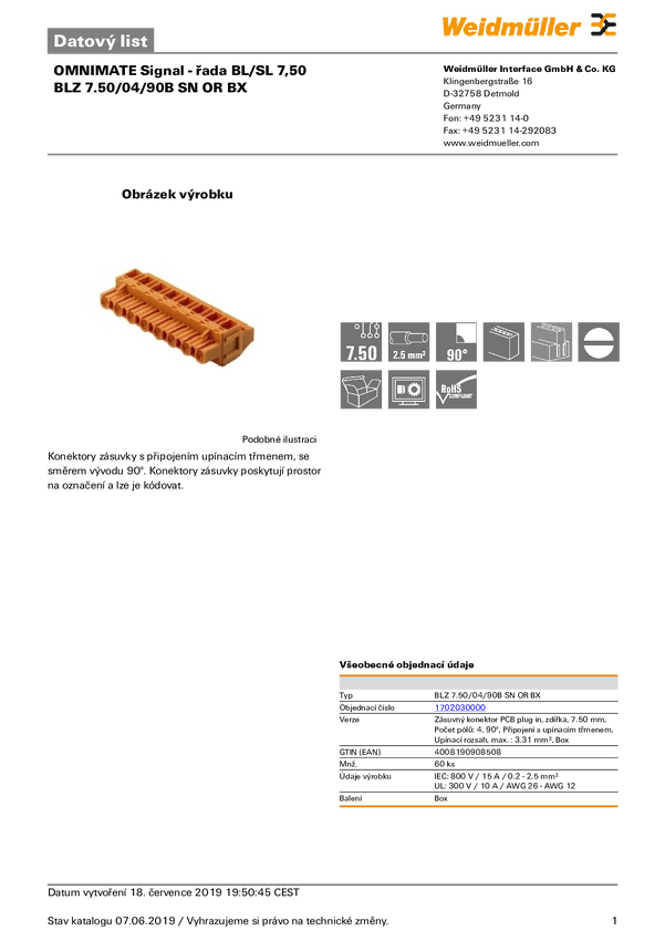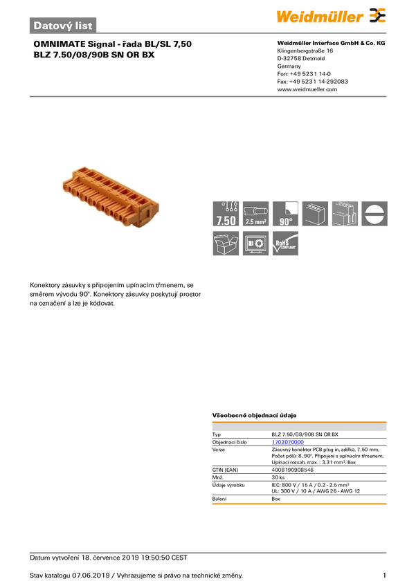 Weidmüller 1702070000 Obudowa złącza pin żeńskiego na kabel BLZ 7.50/08/90B SN OR BX, wire-to-board, piny: 8, 10 A, 30 s