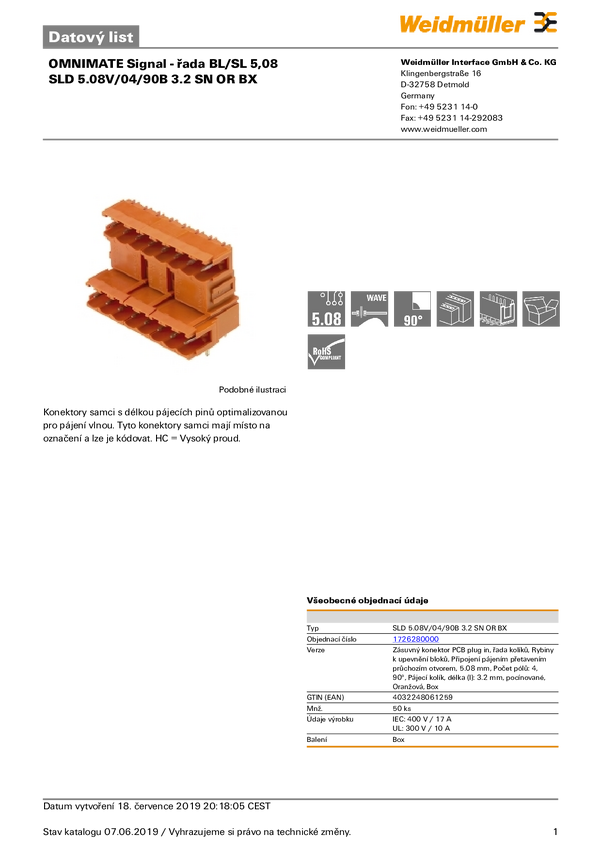 Weidmüller 1726280000 Obudowa złącza pin męskiego na PCB SLD 5.08V/04/90B 3.2 SN OR BX, wire-to-board, piny: 4, 17 A, 50
