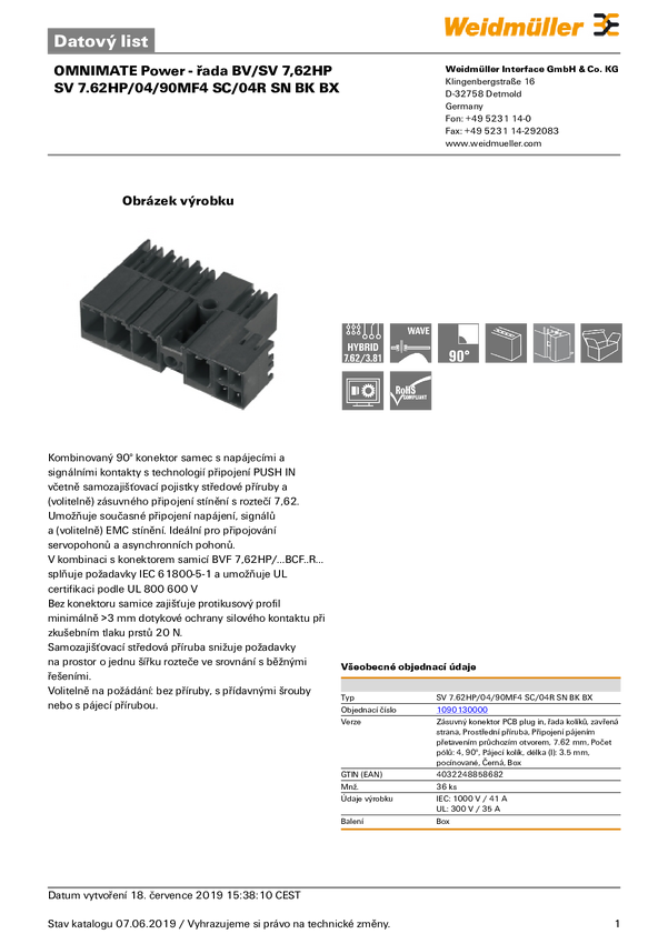 Weidmüller 1090130000 Obudowa złącza pin męskiego na PCB SV 7.62HP/04/90MF4 SC/04R SN BK BX, wire-to-board, piny: 4, 33