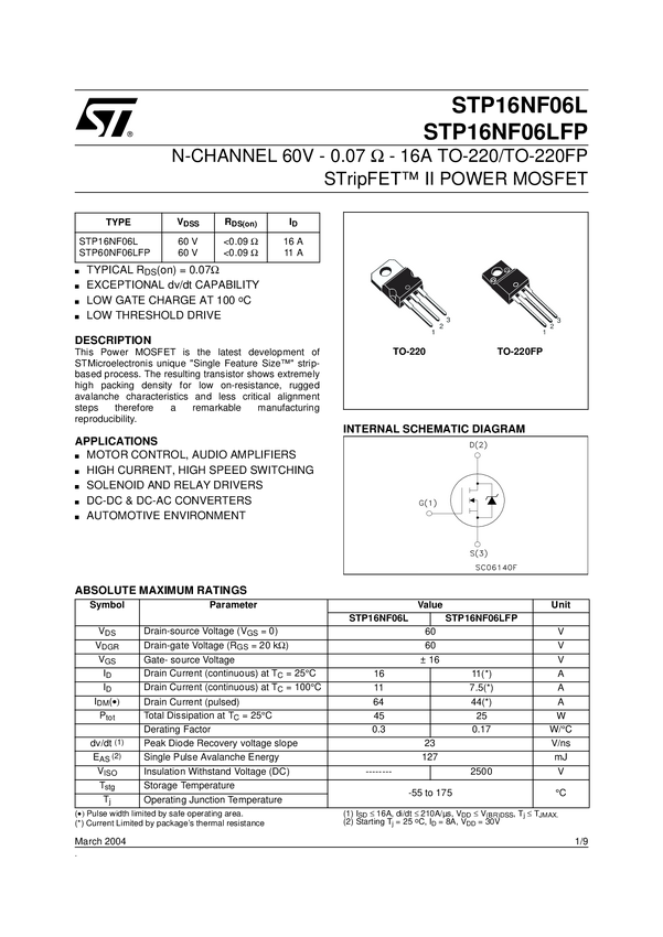 Tranzystor; STP16NF06L; N-MOSFET; 11A (16A); 60V; 45W; 90mOhm; unipolarny; TO220; THT; STMicroelectronics; RoHS