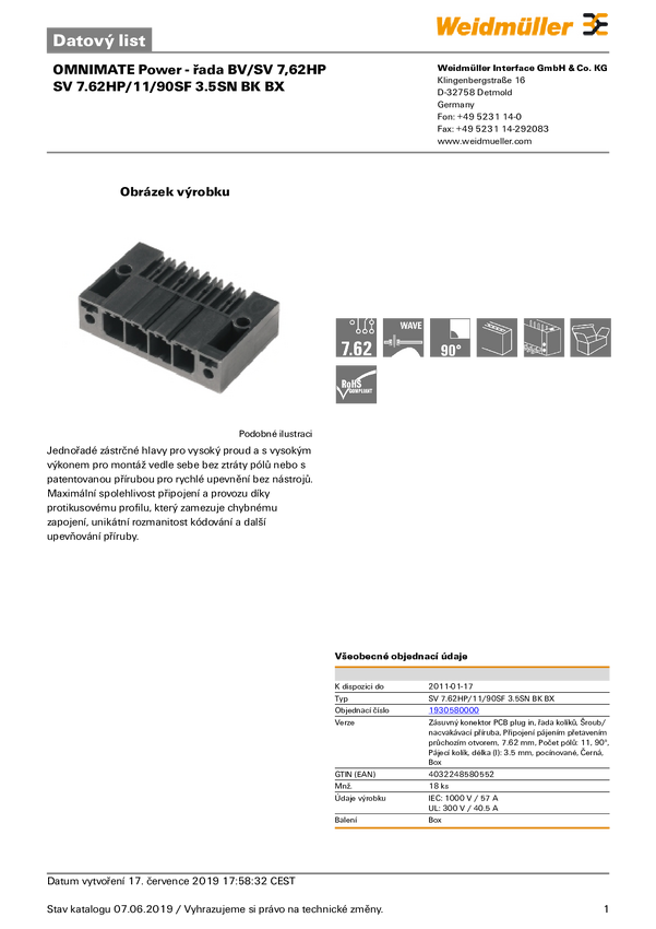 Weidmüller 1930580000 Obudowa złącza pin męskiego na PCB SV 7.62HP/11/90SF 3.5SN BK BX, 18 szt.