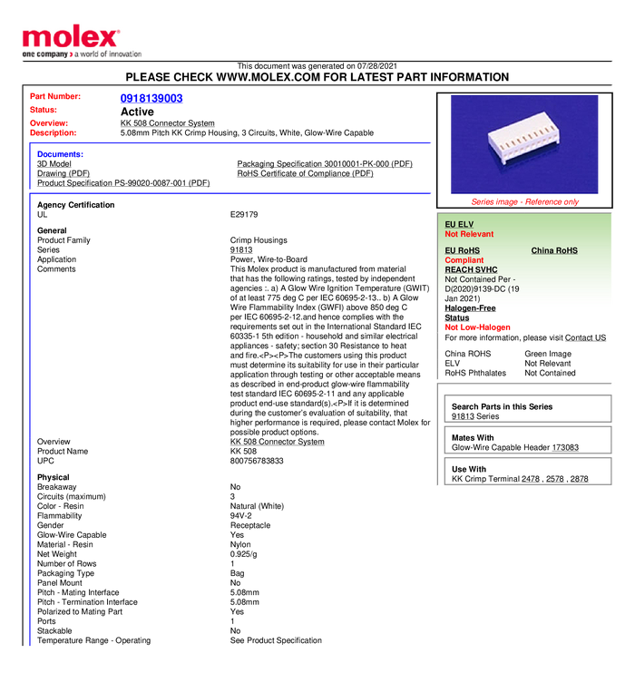 Molex Obudowa złącza pin żeńskiego na kabel Ilość pinów 3 Wymiary siatki: 5.08 mm 918139003 1 szt. torba