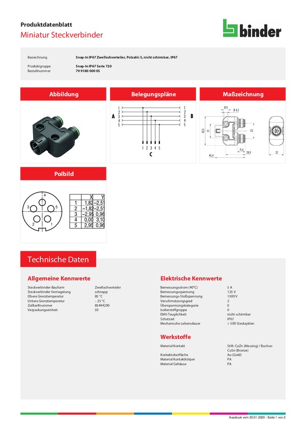 binder 79 9180 000 05 Złącze męskie okrągłe miniaturowe adapter, kształt Y Łączna ilość styków: 5 1 szt.