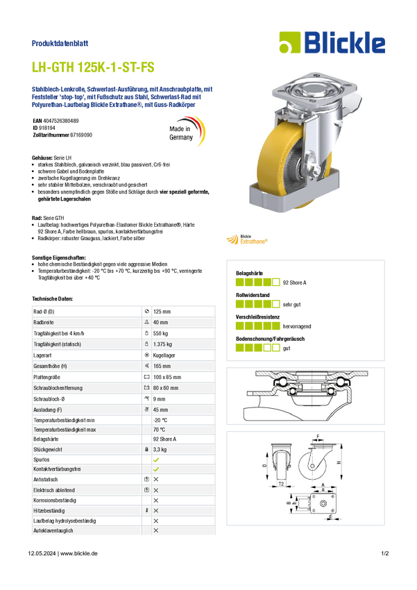 Blickle 918194 LH-GTH 125K-1-ST-FS Rolka obrotowa z blachy stalowej Średnica koła: 125 mm Maksymalne obciążenie: 550 kg
