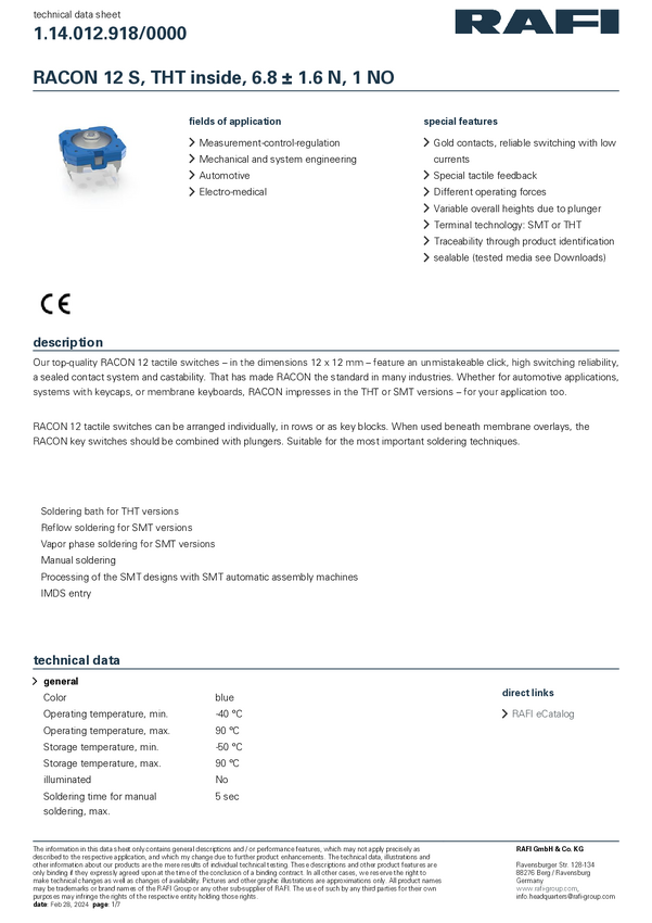 RAFI 1.14.012.918/0000 1.14.012.918/0000 Przycisk 35 V 0.1 A chwilowy (D x S) 12 mm x 12 mm 1 szt.