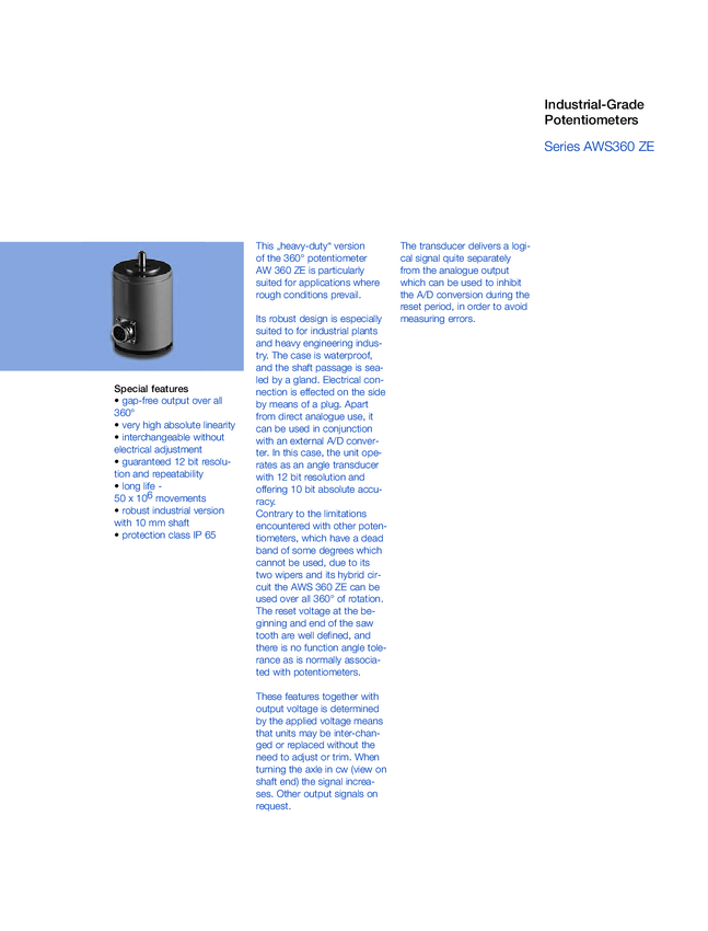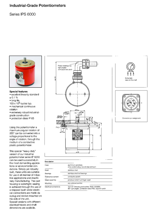 Potencjometr w obudowie przem. IP65, kąt 355stopni, pot. średnica Servi 20 (2"); średnica bębna 82mm; ośka 10mm; dł. 91mm; złącze; trwałość 100.000.000 cykli, lin.0,01 %; std 5 kohm