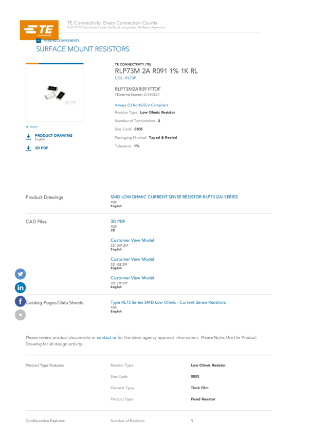 Res Thick Film 2512 91m Ohm 1% 2W ±300ppm/°C Molded SMD Embossed Plastic T/R