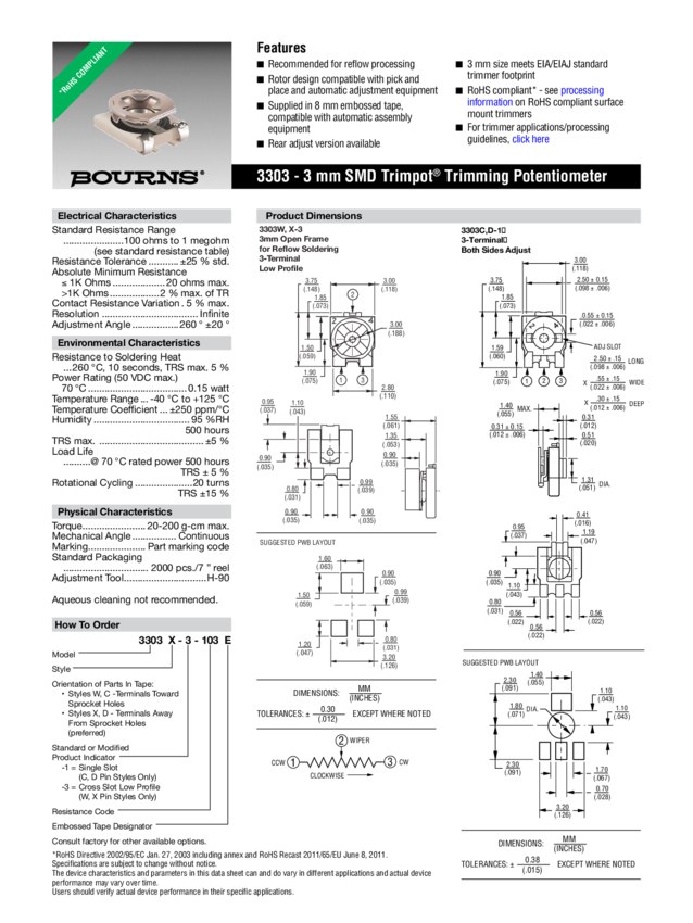 Res Trimmer 500 Ohm 25% 3/20W 1(Elec)/1(Mech)Turn (3 X 3.75 X 1.91mm) Foot Print SMD Embossed T/R