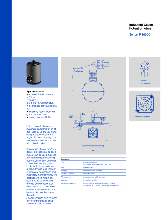Potencjometr w obudowie przem. IP65, kąt 355stopni, pot. średnica Servi 20 (2"); średnica bębna 82mm; ośka 10mm; dł. 91mm; złącze; trwałość 100.000.000 cykli, lin.0,1 %; std 5 kohm (art.no.010061)