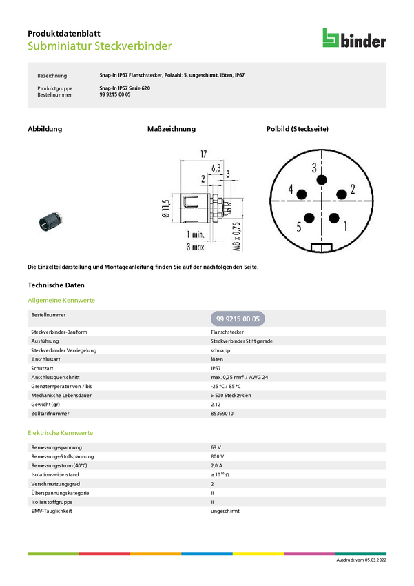 binder 99 9215 00 05-20 Złącze męskie kołnierzowe złącze męskie z kołnierzem Seria: 620 Łączna ilość styków: 5 1 szt.