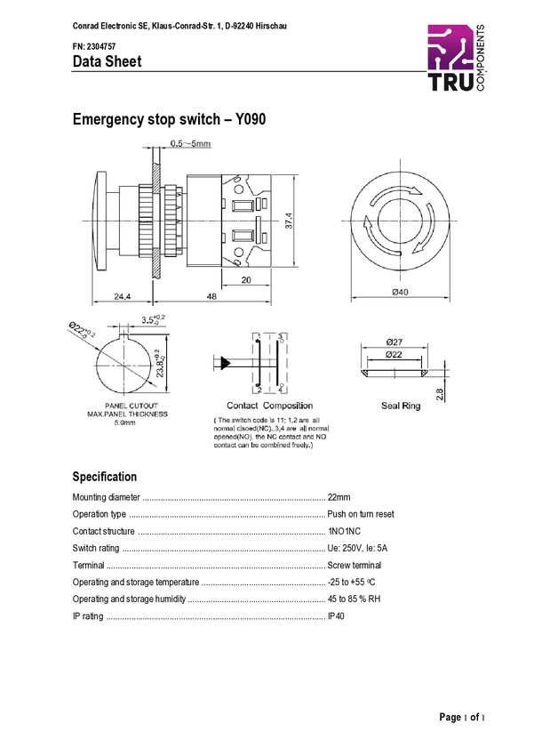 TRU COMPONENTS TC-9219028 Wyłącznik awaryjny Y090, 1 NC, 1 szt.