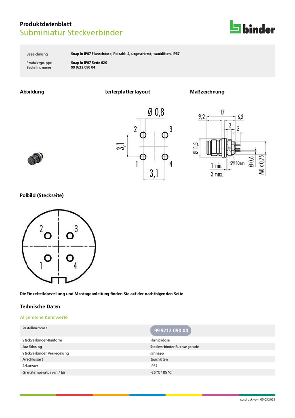binder 99 9212 090 04-20 Złącze żeńskie kołnierzowe złącze żeńskie proste Seria: 620 Łączna ilość styków: 4 1 szt.