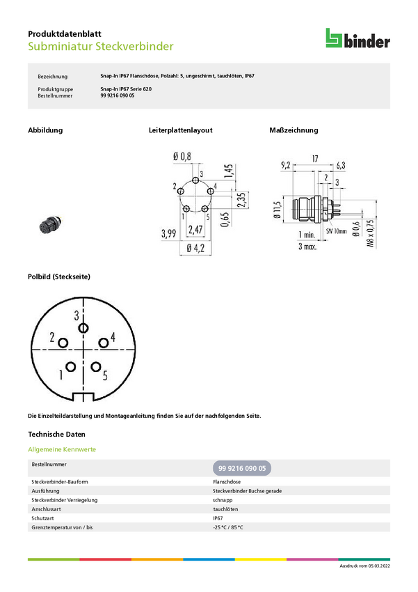 binder 99 9216 090 05-20 Złącze żeńskie kołnierzowe złącze żeńskie proste Seria: 620 Łączna ilość styków: 5 1 szt.