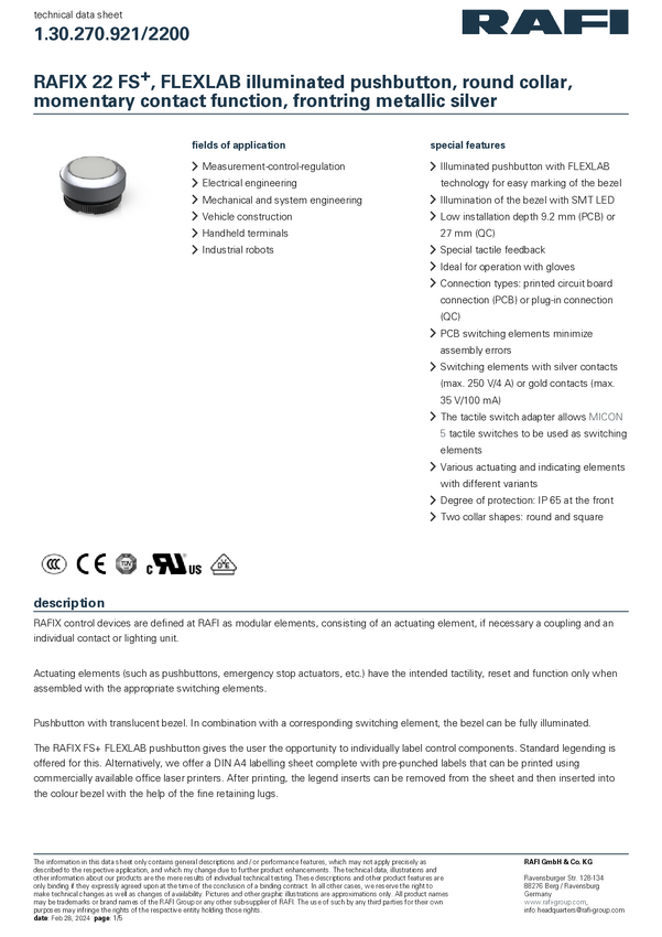 RAFI 1.30.270.921/2200 RAFIX 22 FS Przycisk podświetlany chwilowy (D x S x W) 29.8 x 29.8 x 18.5 mm 1 szt.